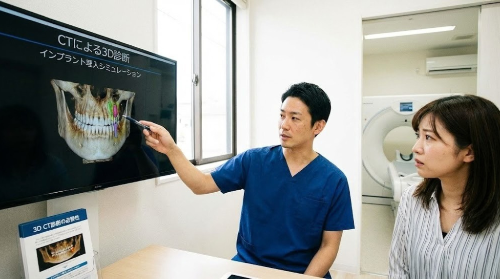 歯科用CTを導入しているかどうかは、インプラント治療を行う歯科医院選びの基本的なチェックポイントです。CT撮影による精密な診断なしにインプラント手術を行うことは、安全性の観点から推奨されません。