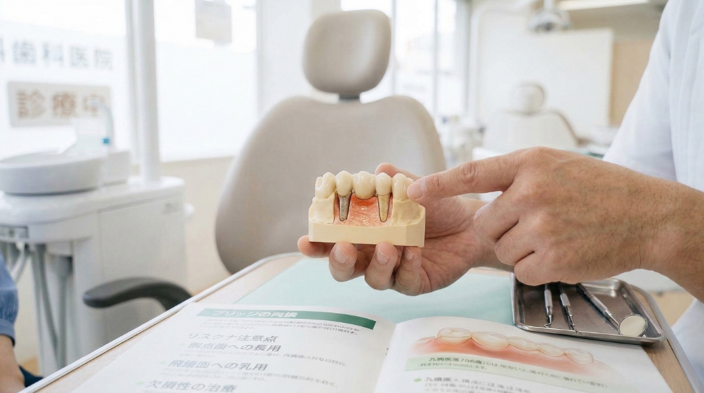 見落とされやすいのが、ブリッジが駄目になった場合の連鎖リスクです。ブリッジの下に虫歯が進行して支台歯を抜歯することになれば、欠損は1本から3本以上に拡大します。ブリッジを選ぶ判断において、「もし支台歯が駄目になったらどうなるか」まで考慮しておくことが肝要です。